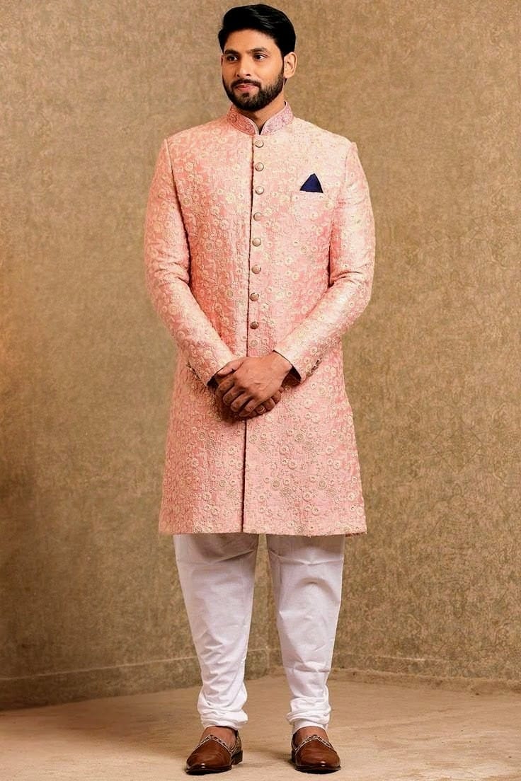 Exude understated elegance with this stunning peach achkan-style sherwani, perfect for weddings, engagements, receptions, sangeet, and daytime festive events. The long sherwani features exquisite all-over tonal self-embroidery with delicate floral and geometric patterns that add subtle texture and shimmer under light. Crafted from premium silk-blend fabric for a luxurious feel, rich drape, and all-day comfort. The classic mandarin collar, decorative buttons, and contrasting navy pocket square elevate the sophisticated look. Paired with crisp white churidar bottoms for a fresh, modern contrast. Ideal for grooms, groomsmen, or guests seeking a soft, romantic color palette. Top searched for peach sherwani for men, embroidered achkan sherwani, wedding sherwani 2025, light color groom wear, designer Indo-western sherwani, reception outfit for men, pastel sherwani set. Available in standard sizes and full custom tailoring for a perfect fit. Order now and make a stylish statement!